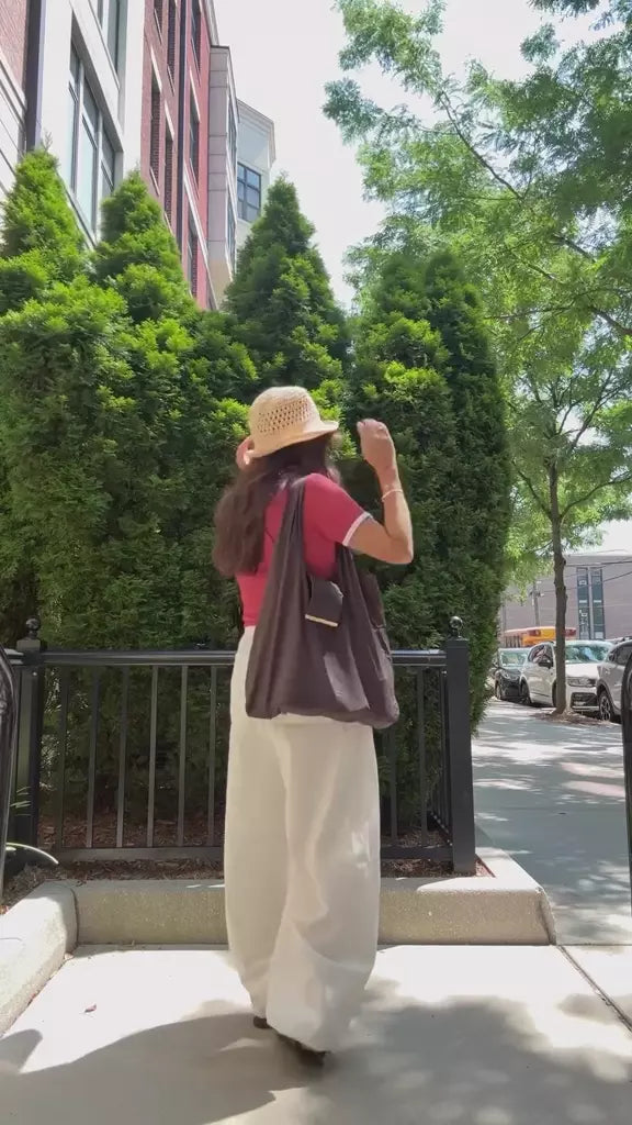 Every detail is intentional, from the tarnish-resistant hardware to the recycled vegan leather and durable nylon. What starts compact unfolds into a full-sized tote designed to carry up to 50 lbs without effort.